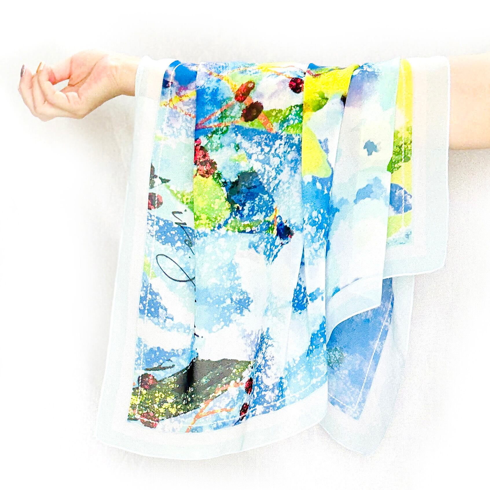 ポリエステル100%のスカーフは丈夫で、身につける、持ち物に巻く、などの普段使いに向いています。