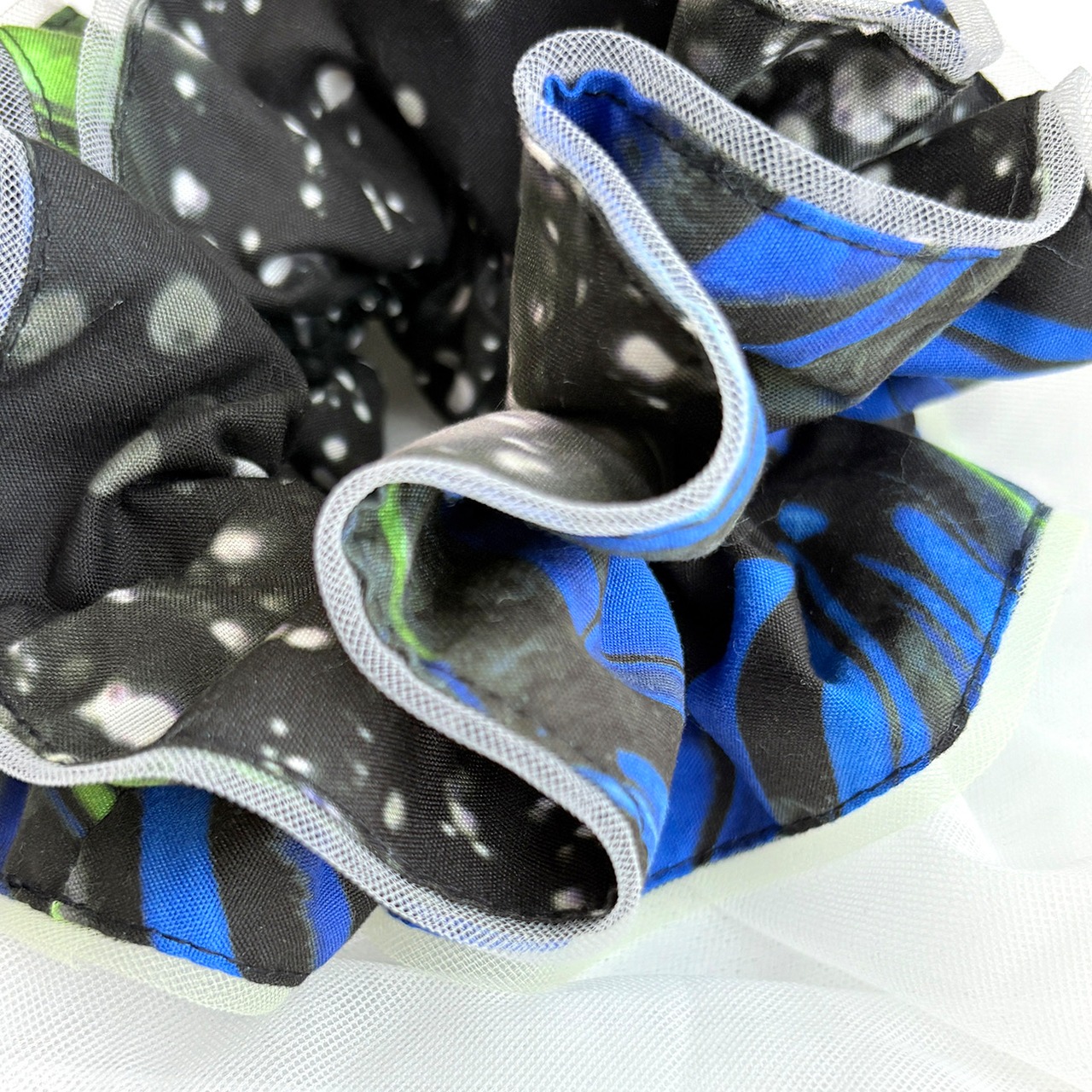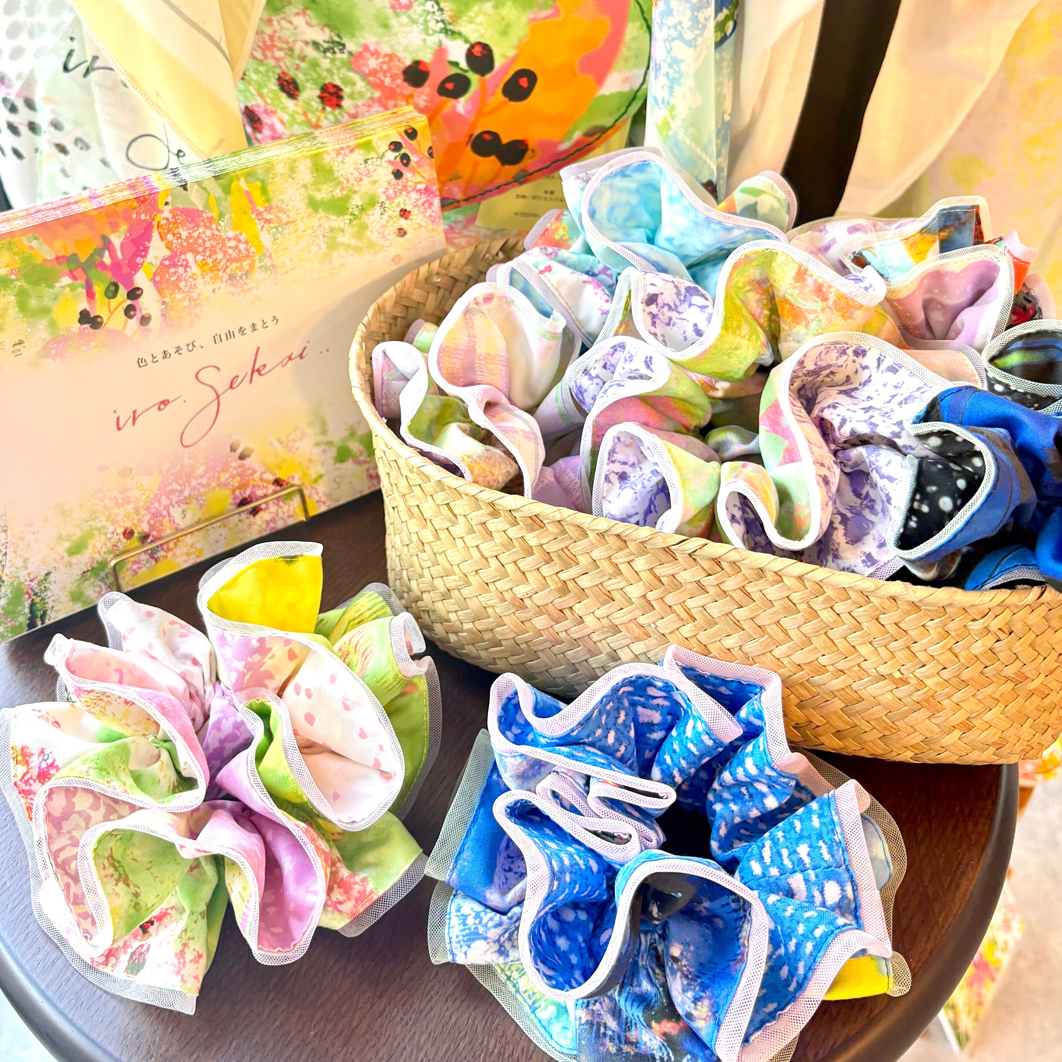 ふんわりボリュームがかわいい、2柄ミックスの大きめシュシュ。