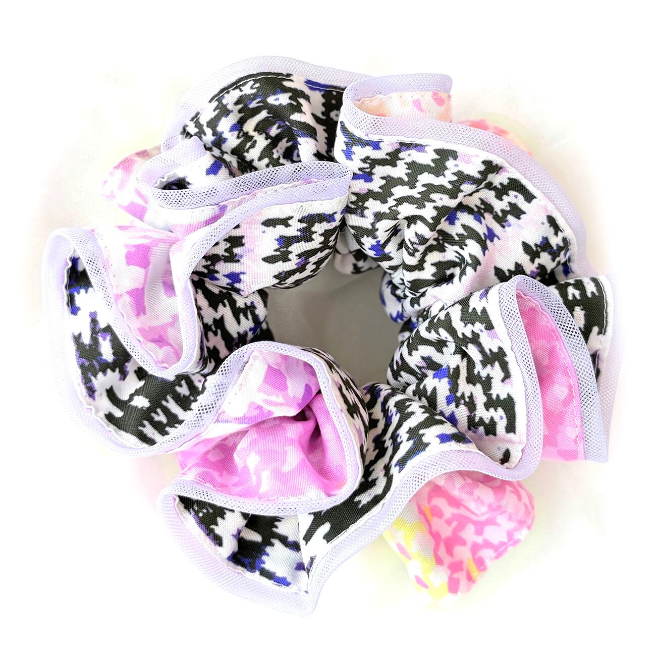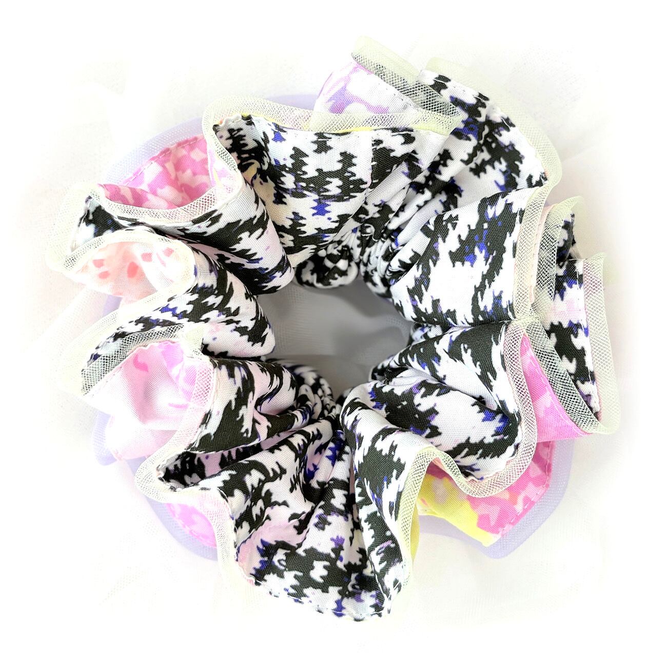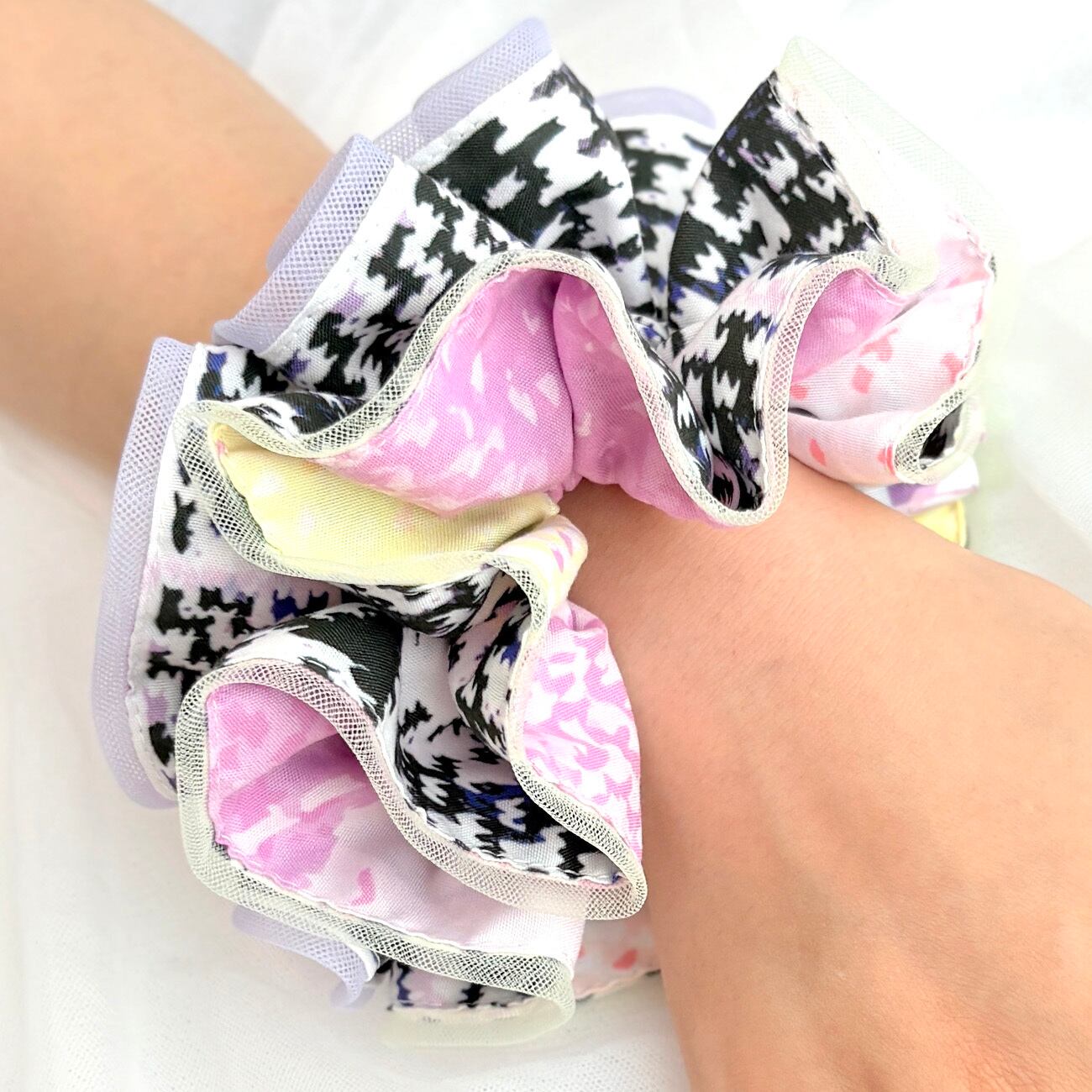 ふんわりボリュームがかわいい、2柄ミックスの大きめシュシュ。