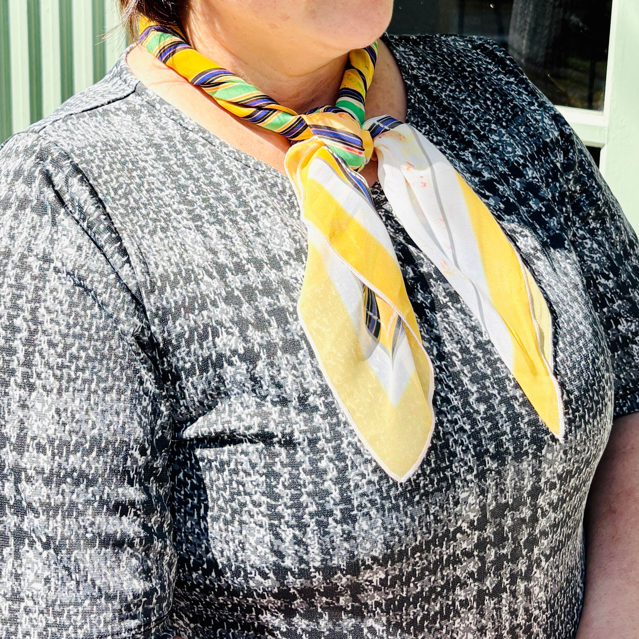 ポリエステル100%のスカーフは丈夫で、身につける、持ち物に巻く、などの普段使いに向いています。