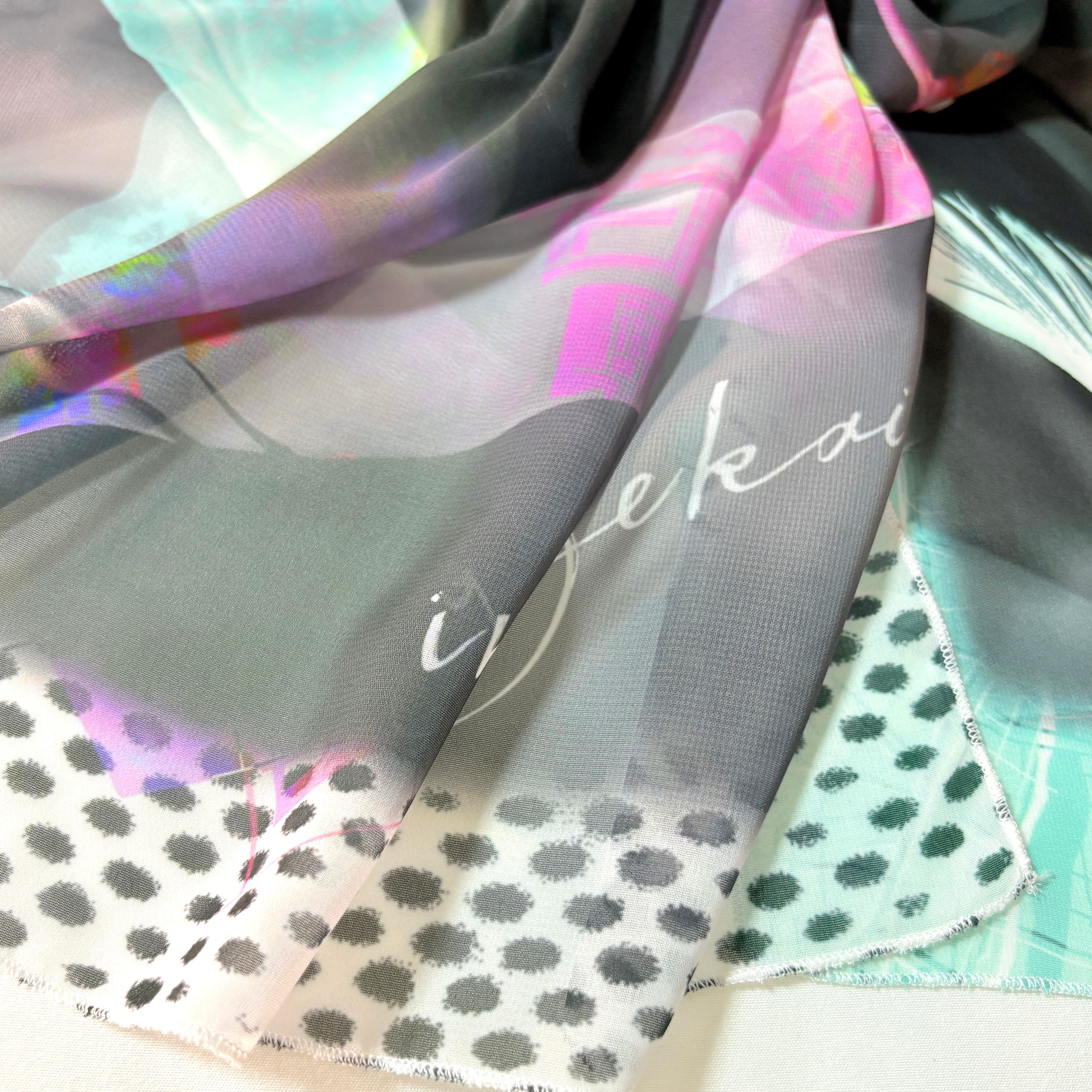 ポリエステル100%のスカーフは丈夫で、身につける、持ち物に巻く、などの普段使いに向いています。